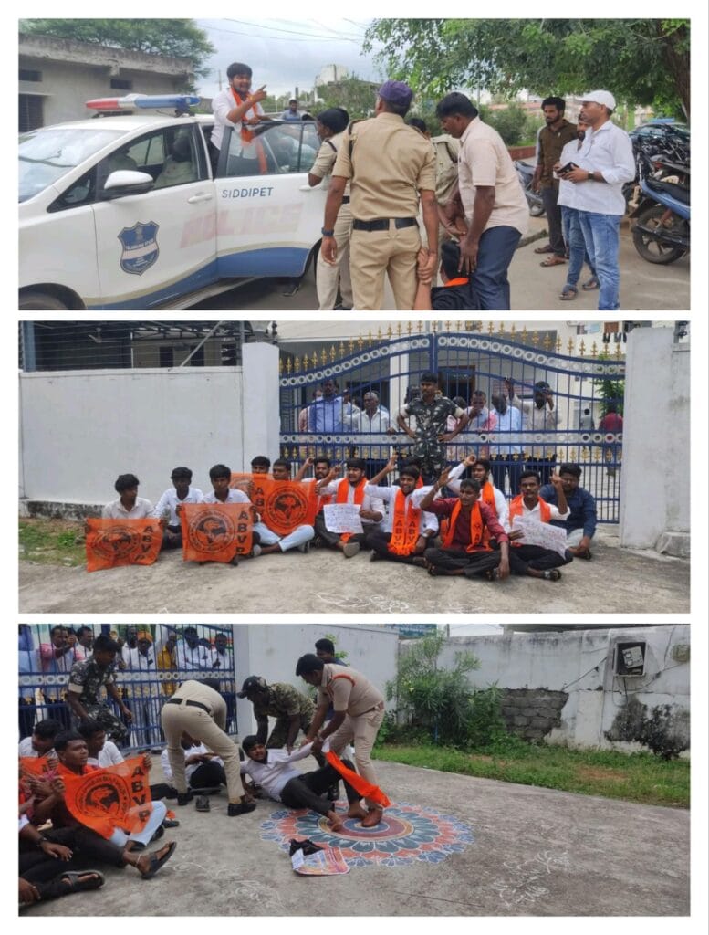 ఈ సందర్భంగా ఏబీవీపీ సిద్ధిపేట జిల్లా కన్వీనర్ సావుల ఆదిత్య మాట్లాడుతూ, రెండు సంవత్సరాలుగా కాంగ్రెస్ ప్రభుత్వం విద్యార్థుల సమస్యలను విస్మరించిందని ఆరోపించారు. బడ్జెట్‌లో నిధులు లేవంటూ నెపం వేస్తున్నప్పటికీ పండుగల సందర్భంగా వందల కోట్ల రూపాయలు కేటాయిస్తున్నారని విమర్శించారు. పెండింగ్‌లో ఉన్న ₹8,300 కోట్ల స్కాలర్‌షిప్, ఫీజు రీయింబర్స్‌మెంట్ మొత్తాన్ని పూర్తిగా చెల్లించకపోతే విద్యార్థులను అడుక్కునే పరిస్థితికి నెట్టేస్తున్నారని ఆగ్రహం వ్యక్తం చేశారు. ఇకపై కూడా ప్రభుత్వం మొండి వైఖరినే కొనసాగిస్తే, రాష్ట్రంలోని ప్రతి చోట మంత్రులను, ముఖ్యమంత్రిని అడ్డుకుంటామని, అవసరమైతే తెలంగాణ ఉద్యమం తరహాలో విద్యార్థుల ఉద్యమం మళ్లీ జోరందుకుంటుందని హెచ్చరించారు. ఈ కార్యక్రమంలో ఏబీవీపీ రాష్ట్ర కార్యవర్గ సభ్యులు రాకేష్, నగర కార్యదర్శులు చరణ్, పరశురాం, జేశ్వంత్, జిల్లా హాస్టల్స్ కన్వీనర్ రాజేష్, విద్యార్థి నాయకులు రాజు, అంజి తదితరులు పాల్గొన్నారు.