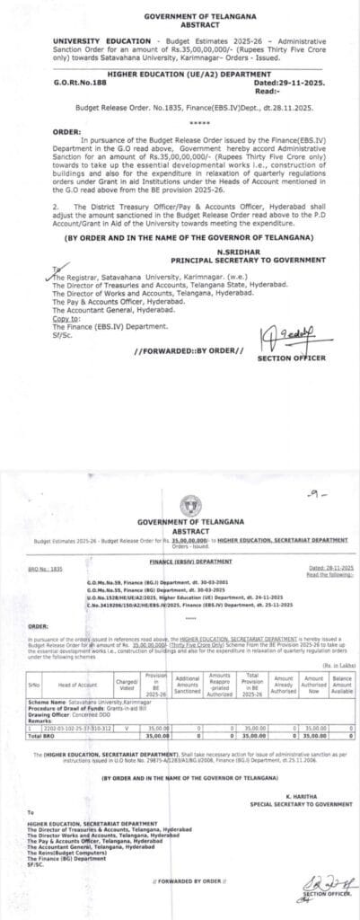 సిద్దిపేట జిల్లా హుస్నాబాద్లో ప్రారంభమైన శాతవాహన యూనివర్సిటీ ఇంజనీరింగ్ కాలేజీ శాశ్వత భవనాల నిర్మాణం, క్యాంపస్ అభివృద్ధి కోసం రూ.35 కోట్లు విడుదల చేస్తూ శనివారం అధికారిక ఉత్తర్వులు జారీ చేసి ప్రభుత్వం కీలక నిర్ణయం తీసుకుంది. ఈ విద్య సంవత్సరం నుంచే హుస్నాబాద్లో ఇంజనీరింగ్ మొదటి సంవత్సరం తరగతులు ప్రారంభమైన విషయం తెలిసిందే, యూనివర్సిటీ ఇంజనీరింగ్ కాలేజ్ శాశ్వత మౌలిక సదుపాయాల ఏర్పాటు కోసం రాష్ట్ర మంత్రి పొన్నం ప్రభాకర్ ప్రత్యేకంగా చొరవ తీసుకొని విడుదల చేయించిన భారీ నిధుల తో భవనాలు, ప్రయోగశాలలు, లైబ్రరీ, హాస్టల్, రహదారులు వంటి సదుపాయాల ఏర్పాట్లు మరింత వేగవంతం కానున్నాయి. హుస్నాబాద్ విద్యార్థుల భవిష్యత్కు కోసం తీసుకున్న ఈ నిర్ణయం జీవితాలను మార్చనుంది అని ఆనందం వ్యక్తం చేశారు. స్థానిక ప్రజలు, తల్లిదండ్రులు ఈ నిర్ణయాన్ని స్వాగతిస్తూ, హుస్నాబాద్ త్వరలోనే విద్యా కేంద్రంగా రూపుదిద్దుకోవాలని ఆశాభావం వ్యక్తం చేశారు.