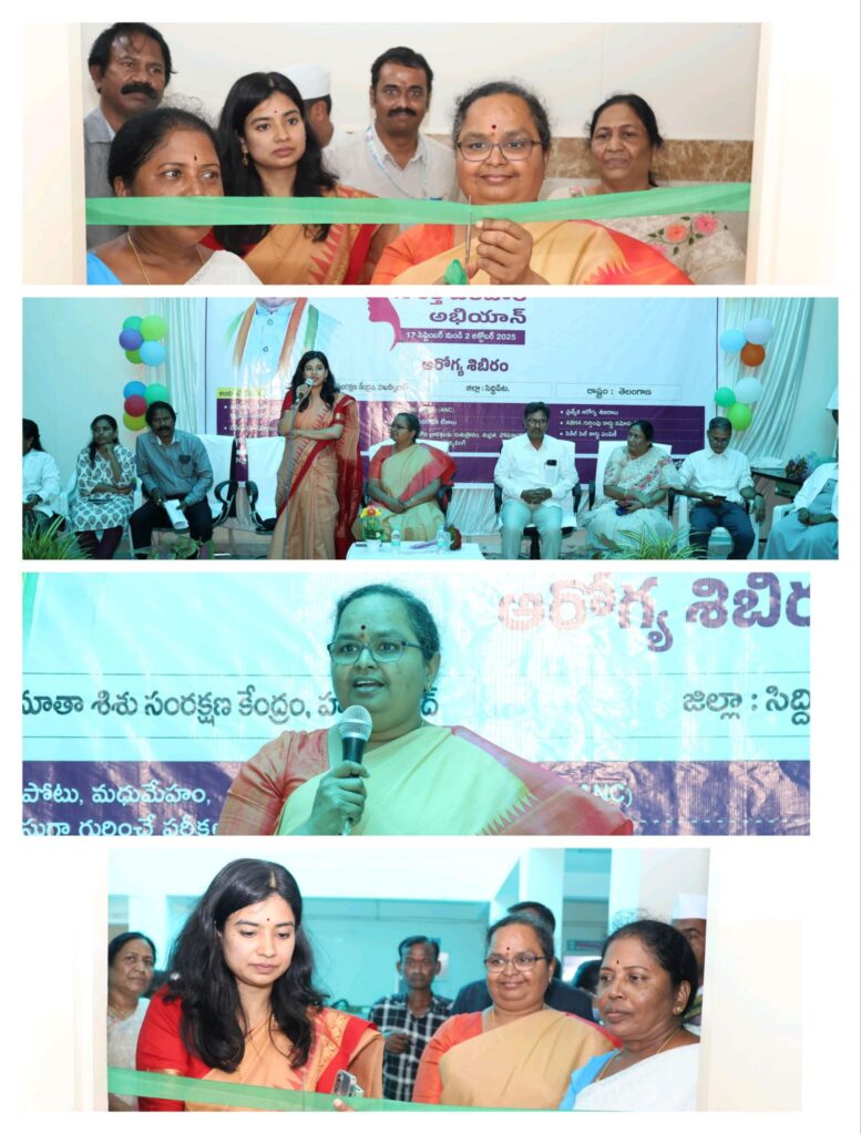 సిద్దిపేట జిల్లా వ్యాప్తంగా మహిళల ఆరోగ్య సాధికారత కోసం “స్వస్థ నారి స్వశక్తి పరివార్ అభియాన్ – ఆరోగ్యవంతమైన మహిళ, బలమైన కుటుంబానికి పునాది” పేరుతో గల జాతీయ స్థాయి ఆరోగ్య కార్యక్రమాన్ని హుస్నాబాద్ ప్రభుత్వ ప్రసూతి ఆసుపత్రిలో జిల్లా కలెక్టర్ కె.హైమావతి ఐఏఎస్, అదనపు కలెక్టర్ గరిమ అగ్రవాల్ ముఖ్య అతిథులుగా పాల్గొని ప్రారంభించారు. ఈ కార్యక్రమ ముఖ్య ఉద్దేశం ఈ నెల 17 నుండి అక్టోబర్ 2 వరకు జిల్లాలోని అన్ని ప్రాథమిక ఆరోగ్య కేంద్రాల్లో, బస్తి దవఖానాల్లో, AAM, CHCs, etc (మహిళలకు, కుమార దశ బాలికలకు ) మెడికల్ క్యాంపులు, బ్లడ్ డొనేషన్ క్యాంప్స్, నిర్వహించడం, ప్రతిరోజు 8 వైద్య శిబిరాలను( మెడికల్ క్యాంప్స్ ), 12 రోజులు( సెలవులు మినహాయించి ) నిర్వహిస్తారని తెలిపారు. ఈ ఆరోగ్య శిబిరాల్లో ప్రత్యేకమైన వైద్య నిపునులచే జనరల్ మెడిసిన్, గైనకాలజిస్ట్, ఆప్తాల లిస్ట్, దంత వైద్యులు, చెవి ముక్కు గొంతు, చర్మవ్యాధుల, మానసిక వైద్య నిపుణులు ద్వారా 14 రకాల ఆరోగ్య సేవలు అందిస్తారు.
